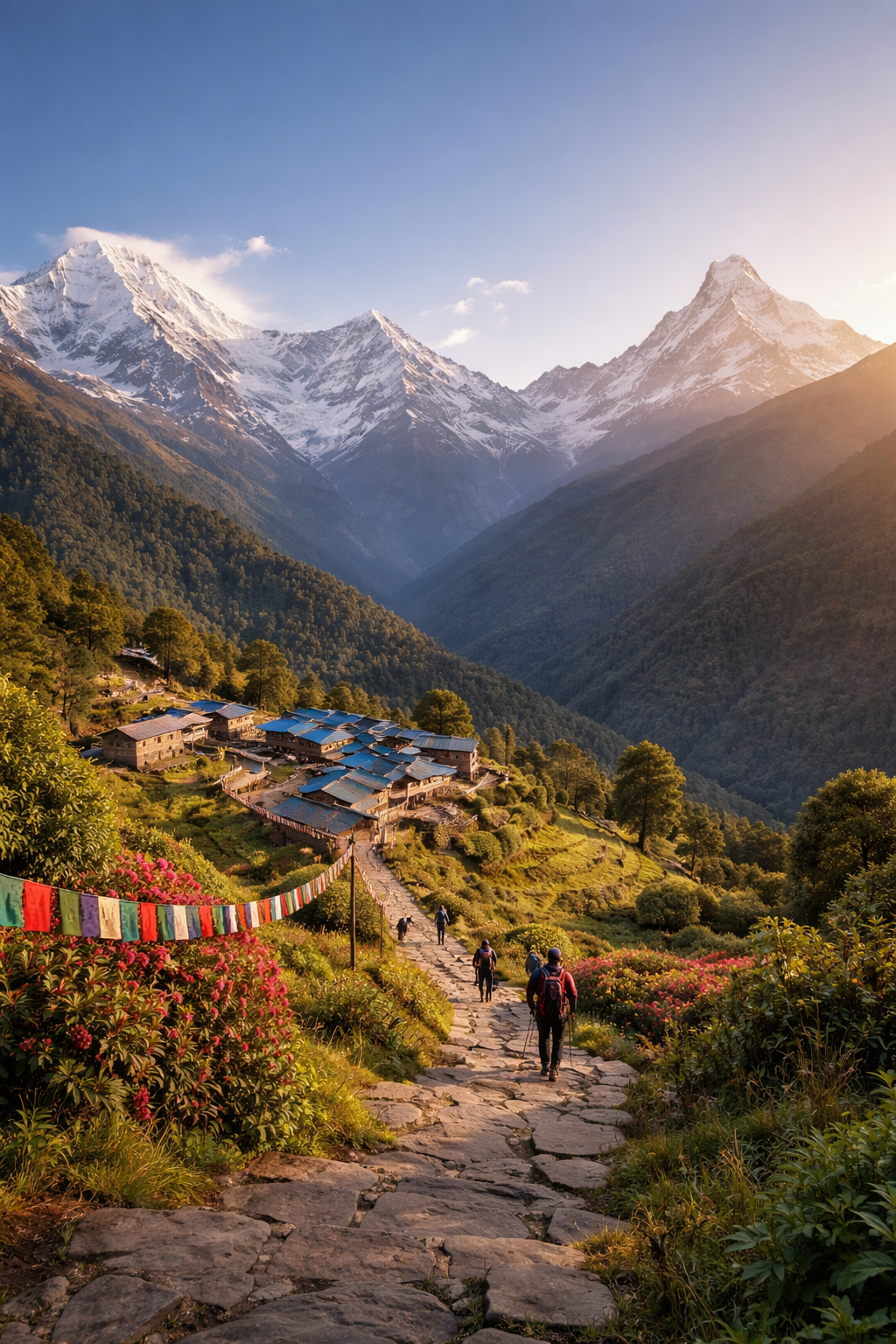 Starting from Pokhara, the trail passes through lush rhododendron forests, terraced farmlands, and traditional Gurung villages before gradually ascending into alpine landscapes. The trek culminates at Annapurna Base Camp (4,130m), offering spectacular 360° views of Annapurna I, Annapurna South, Hiunchuli, and the iconic Machhapuchhre.